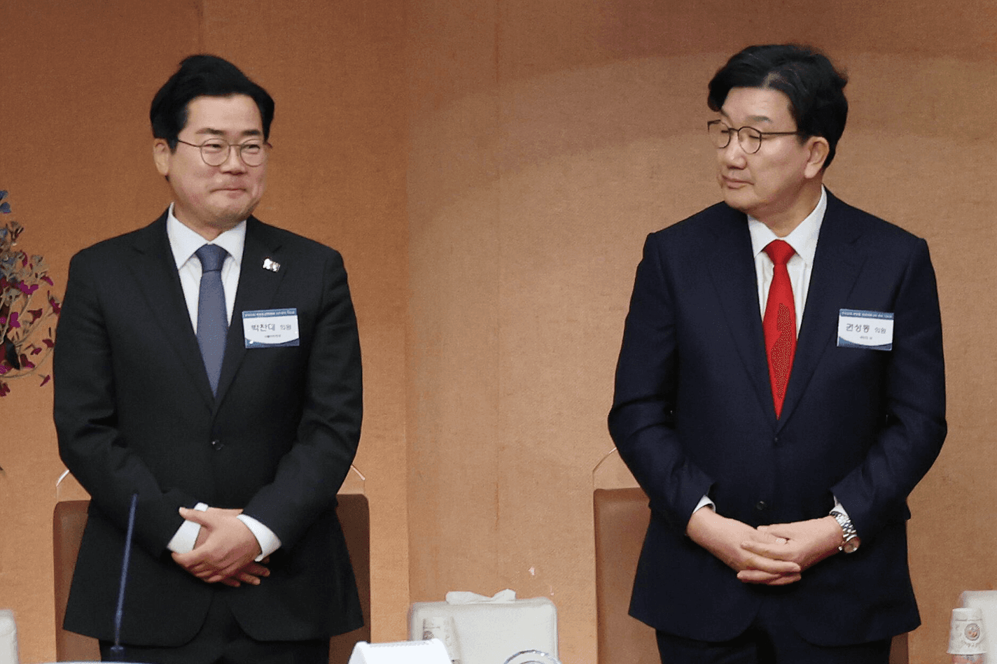 권성동(오른쪽) 국민의힘 원내대표와 박찬대 더불어민주당 원내대표가 16일 오후 서울 영등포구 여의도 순복음교회에서 열린 한국교회 부활절 연합예배 준비 기도회에 참석해 예배하고 있다./뉴시스