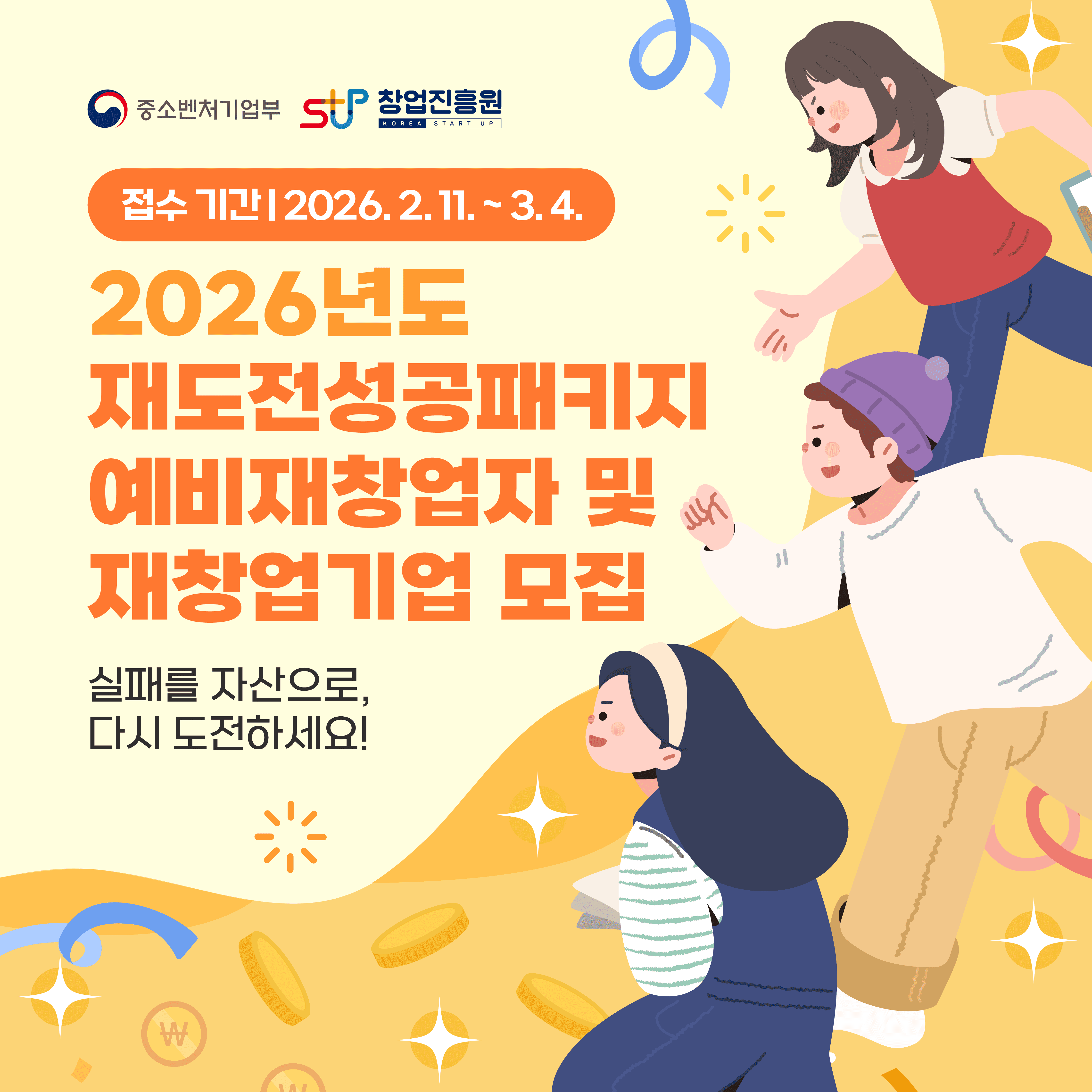 성실한 실패 경험과 우수한 아이템을 바탕으로 성장 가능성이 높은 (예비)재창업기업을 발굴하고, 패키지형 재창업 지원을 위한「2026년도 재도전성공패키지 (예비)재창업기업」을 모집하오니 많은 관심 부탁드립니다.